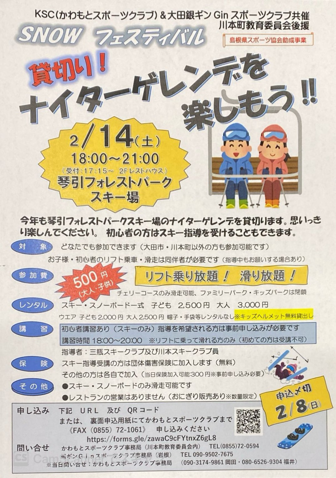 SNOW フェスティバル 【貸切り ナイターゲレンデを楽しもう】 コミュニティ 2026.01.212026.01.23 KSC(かわもとスポーツクラブ)& 大田銀ギンGinスポーツクラブ共催でイベントを企画しました。 開催日:2月14日(土)18:00~21:00 場所:琴引フォレストパーク 対象:何方でも参加できます。(大田市・川本町以外の方もOK) 参加費:500円 ■ スノーフェスティバルチラシ 58fc28f08a6cb92386a64369cee633c2